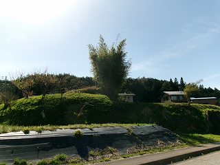 その上の畑の中を進んで行くと、陣ヶ洞砦のある山稜が見えている。下の方は草が刈られており、城塁がむき出しになって見えている。ただし、中腹部に獣除けの柵が巡らされているようだ。