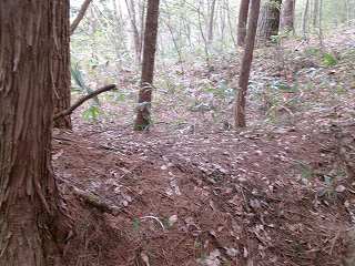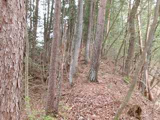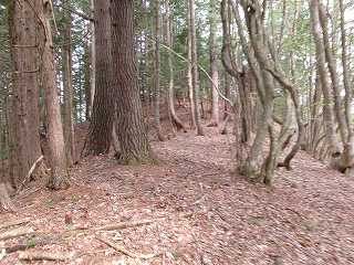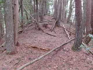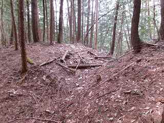 切通しの所から尾根に取り付いて登って行くと、くの字方に湾曲した土塁があった。これはいったい何なのだろう。防御遺構とは思われないが、人工的な建造物であることには間違いない。一応城郭遺構と見てよいのだろうか。