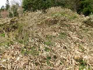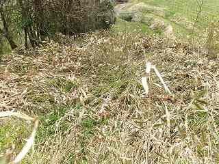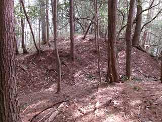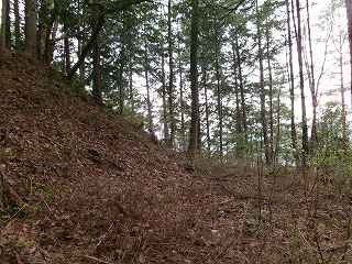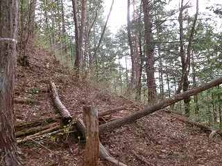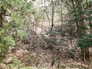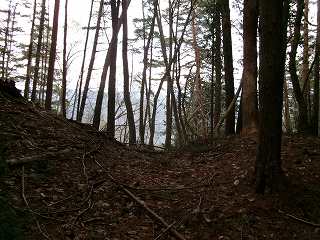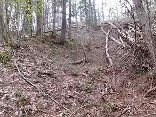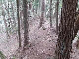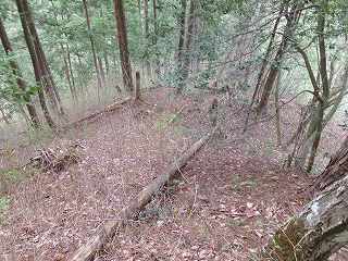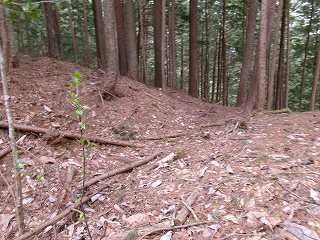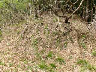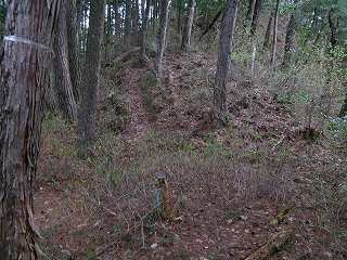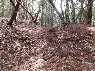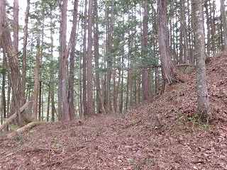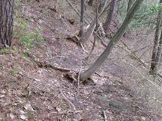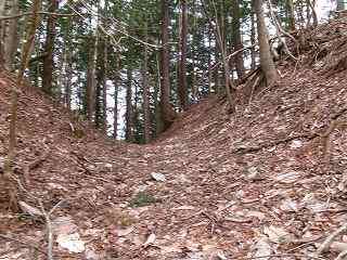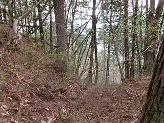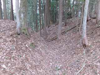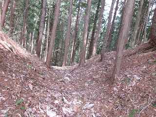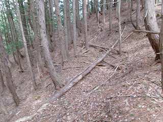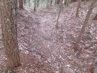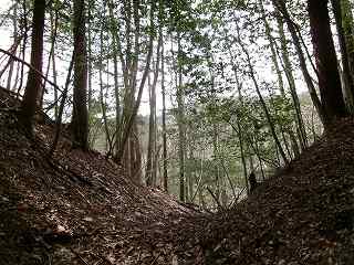| 今村林道の途中にある供養塔。ここから取り付いてみた。 | 巨大竪堀を通って登る。 |