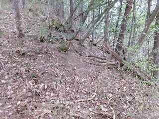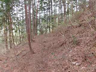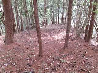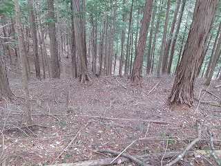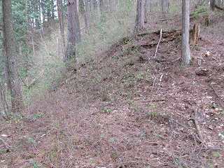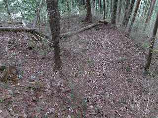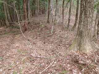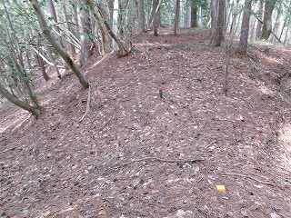 その先の斜面には切通しの通路が3つほど付けられている。その上を登って行った所に堀切があり、越えて行ったところが1郭である。1郭の周囲には帯曲輪が造成されている。