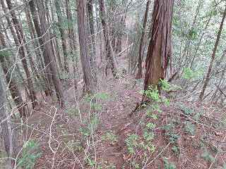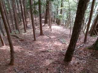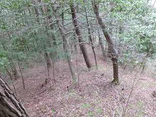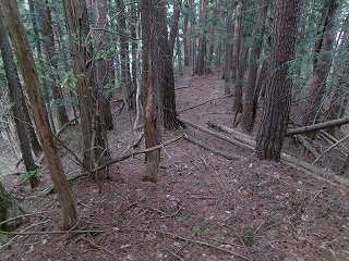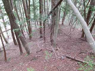 急斜面であるが、我慢して登って行く。すると竪堀状の所まで来た。後はテキトーに登って行った所、堀切の所に出た。