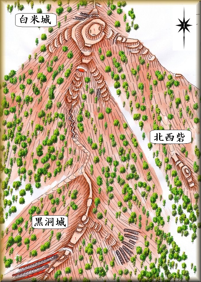 白米城の場所。 黒洞城の場所。 黒洞城に取り付いた場所。