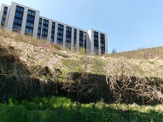 ということで、どこかよじ登れそうな斜面がないかと伺いながら車を進めていったのだが、ずっと急斜面が続いており、とても登れそうな感じではない。