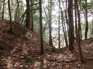 | 今村林道の切通し。右上が牛追砦 | くの字に延びる土塁 |