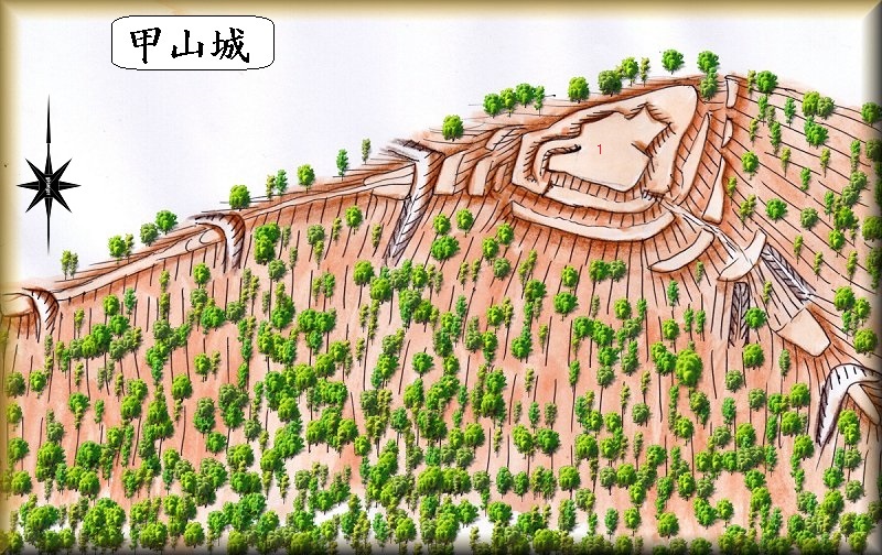 今回、甲山城まで訪れる時間はなかったのだが、参考までに上記の書の図面に基づいた鳥瞰図を作成して提示しておく。