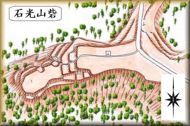 石光山砦は、多賀山城のある南側の山稜に築かれている。山麓からの比高は70mほどであり、ちょうど山王トンネルの真上辺りに位置している。