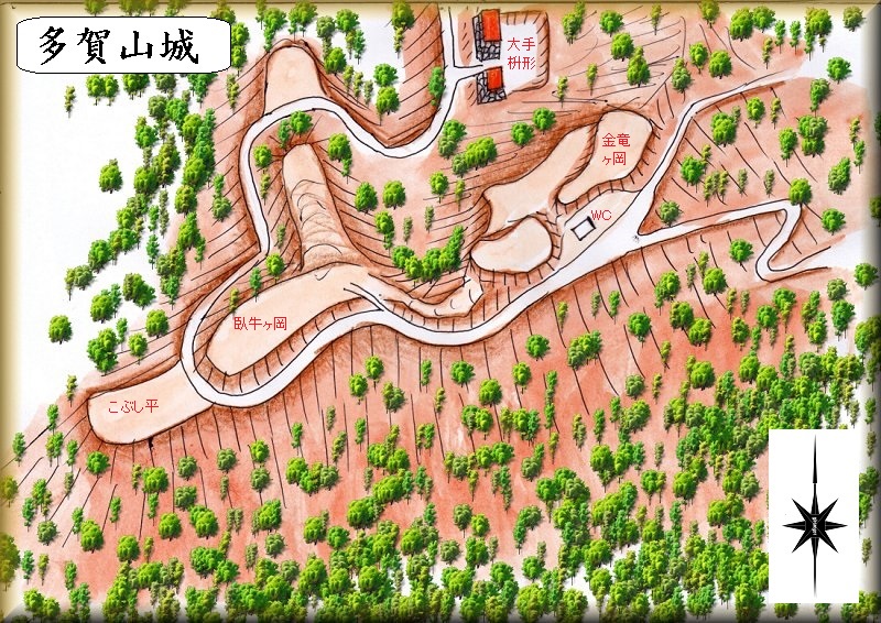 多賀山城は高山城の背後の山稜部分にあり、高山城の城山公園の一部に取り込まれている。