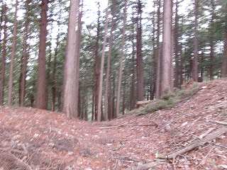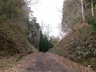 さて、林道をどんどん進んで行くと、やがて道は沢を越えて右手の斜面下を通るようになっている。この辺りからが砦まで最も近い位置になる。