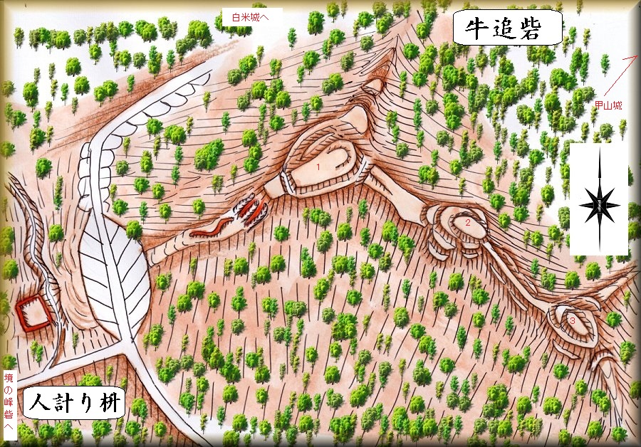 今村峠周辺に展開する多数の城郭群の中でも最高所にあるのが甲山城であり、牛追砦からの比高は100mほどとなっている。