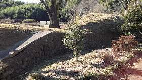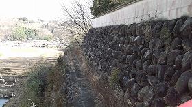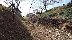 | 北側にわずかに残る堀の跡。 | 北側に残る城塁。なかなかの規模である。 |