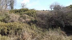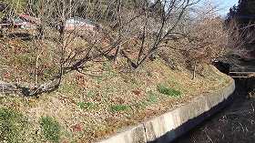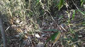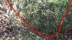 さて、帰りも笹薮を掻き分けながら斜面を降って行ったのだが、山麓近くになって切り通し状の道に遭遇して、それを降りて行ったら、切り通し部分を中央を石垣でせき止めているような遺構を発見した(下の写真)。城郭遺構かどうかは不明だが、ちょっと気になったので一応紹介しておく。