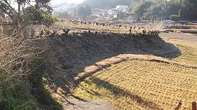 | 北側上の墓地の辺りから城内を見降ろしたところ。 | 2郭先端の城塁。 |