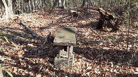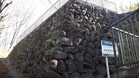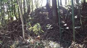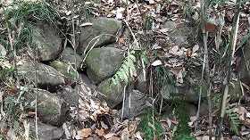 | 1郭城塁。笹ヤブがひどくて、何が何やら・・・・。 | 中腹の切り通し通路にあった石積み。何のためのものか不可思議である。 |