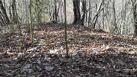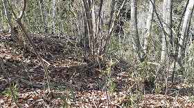 墓地から南側はヤブになっているが、こちらは改変されていなさそうなので進んでいってみる。すると南端までにはいくtかのピーク部があった。その間は鞍部となっているのだが、堀切というほどしっかりとしたものではない。ピーク部もきちんと削平されてはおらず、ほとんど自然地形のままであった。あまり人口の手を入れていない山城であったものだろうか。
