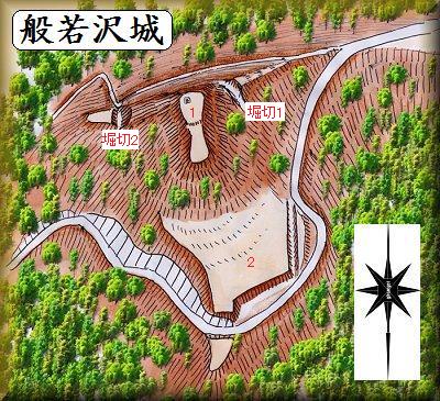 だが、狭隘な山頂部に比べ、まとまった広さのある部分を兵の駐屯地として利用するという発想には合理性がある。あるいは2は、山道を監視するための番所が置かれていたところであったという可能性も検討の余地がある。かつて、この城の側面部を通る街道があったとすれば、般若沢城は、その街道を掌握するための城郭であったという可能性も見てよいだろう。