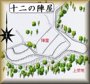 秋間川に架かる伊豆村橋のすぐ北側にそびえる比高40mほどの台地の上に十二の陣屋があった。