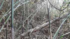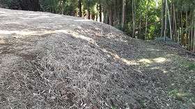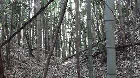 直登と言ってもそこからの比高は20mほどであるからたいしたことはない。かなり急な斜面であったが、すぐに平場に出た。右の図の2郭である。この斜面、高さはそれほどでもないのだが、かなり急なため、何かに掴まらないと登れない。そこで竹に掴まりながら登って行くのだが、腐りかけている竹も多く、掴まった竹がボキッと折れることたびたびであった。気を付けないと危険である。
