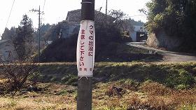 | 南側の谷戸部分。現在も段差は見られるが、北側とは違って、こちらはそれほど急峻ではない。 | そこにあったクマ注意の表示。こんな集落の真ん前までクマがやって来るのであろうか。群馬のクマ、恐るべし! |