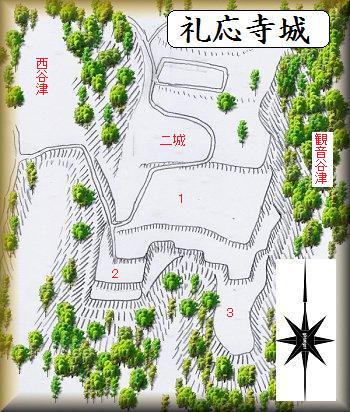 秋間川に架かる岩下橋の東側300mほどにある、比高30mほどの台地の先端部付近が礼応寺城の跡である。「二城」という地名の残っている台地であり、別名を二城とも言うようだが、これは「御城」の転であると思われる。