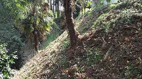 | 堀切2。こちらの方は削られた斜面になっており、規模も大きく堅固である。 | 2の平場の先端の張出部分の城塁。 |