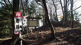 この平場を過ぎて東側の登山道に向かう。すると道は再び細くなり岩場の脇を登っていく。登ったところにちょっとした平場があり、そこに案内板が立てられていた。ここから南側に延びた尾根に郷原城が築かれている。手前の平場からは北側に向かって登山道が伸びており、郷原城はこのルートを監視するための城郭であったと考えられる。
