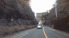 城のある台地の南側を通っている県道は、かなり巨大な切通しとなっている。これがそのまま堀であったとはさすがに考えられないが、かつてあった堀を利用している可能性は高いと思う。北側の城内側への道は2か所あり、そのどちらにも「根古屋の湯」の案内が出ている。