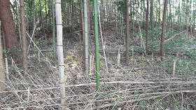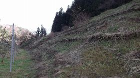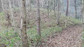 | 東側山麓から見た三島根小屋城。 | 東側の一番低い平場の城塁。 |