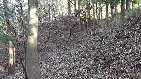 それを上がると、すぐまた2郭の城塁が見えてきた。高さ2m程度の微妙な段差である。2郭はヤブではなく見晴らしがよくなっている。その奥には1郭の城塁が見えている。こちらの城塁も高さ1mくらいのわずかなものであった。