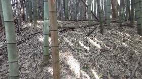 1郭内部は一面の竹藪となっており、ちょっと歩きにくい。それでも長軸30mほどはあるのが分かる。そしてその先はかなりひどいヤブである。