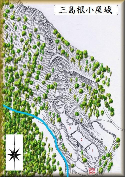 三島根小屋城は、JR岩島駅の南600mほどの所にある。諏訪神社の背後の山稜である。