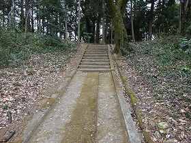 石段を登って行くと、山頂の少し手前で、ちょっとした段差が見られた。この脇が帯曲輪になっているようであるが、それほど明瞭なものではなかった。