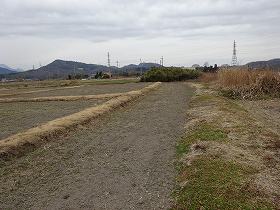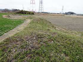 県道の東側はすっかり耕地整理が行われてしまったようで、遺構は完全に破壊されてしまっているが、県道の西側は、現状でもなんとなくかつての城塁のラインを留めている。北側に一直線に窪んだラインは、堀の跡と一致していそうである。