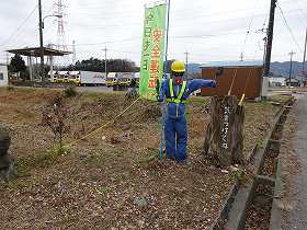 この堀跡、ほんの一部なので、車で通っているとついつい見過ごしてしまいそうであるが、現在は、すぐ脇に交通安全の人形が立てられているので、それを目印にすれば見落とすことはない。それにしてもこの人形、顔がちょっと不気味すぎる。この人形を見て脇見運転をしてしまったら、それこそ安全運転とは逆の効果を生み出しかねない。
