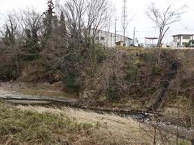 | 北西角にわずかに残る堀の跡。場所が分かりにくいが、写真の交通安全人形(不気味!)が目印になる。 | 鮎川越しに城址方向を見たところ。鮎川が西側の防衛線となっていた。 |