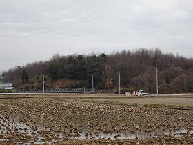 | 南側から遠望する常岡城。比高15mほどの低い山である。 | 南側の城塁と腰曲輪。 |