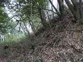 | 東側にある虎口状の部分。これがかつての南側の堀跡であるらしい。 | 北側城塁に見られる土塁。 |