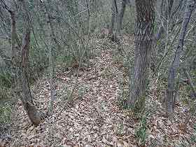 | 北側から見た大神宮山。正面奥に鳥居が見えている。 | 北側の参道。この両脇が帯曲輪なのだが、あまり明瞭ではない。 |