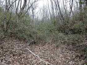 | 東側の土塁。高さ1.5mほどもあり、櫓台状に幅広になっている個所もある。 | 北側の虎口。この手前まで道が付けられている。 |