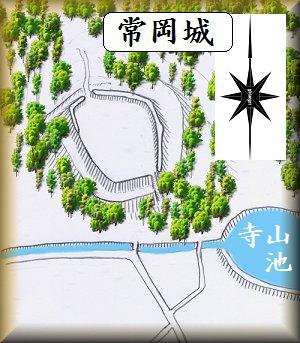 本郷の寺山池の北西にそびえる比高15mほどの台地先端部に常岡城は築かれている。
