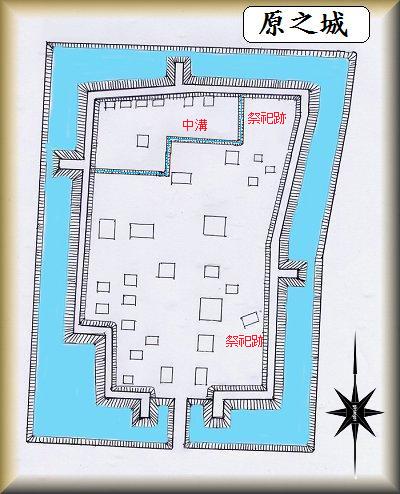 原之城は、あずま跨道橋の北西300mほどの一帯にあった。現在、遺構は湮滅してしまっているが、この場所に案内板が設置されており、駐車場もある。かつて発掘調査も行われたようであり、その成果となる鳥観図が案内板に紹介されている。右の図は、それを基にして描いてみたものである。