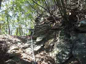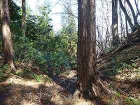 | その先の腰曲輪から東の堀切を見たところ。 | 下の帯曲輪の途中にある竪堀。 |