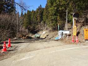 | 林道の脇にある桐の城山ハイキングコースの入口。2018年3月現在、林道の工事が行われていて、工事が完成したら、城のすぐ近くまで車で行けるようになりそうである。 | 城山との分岐点には、この赤い鳥居があるので、こちらの尾根に進んでいく。ここまで車で来られるようになるはずである。駐車スペースもある。 |