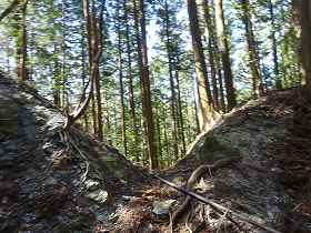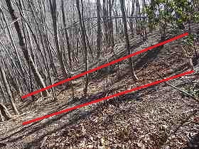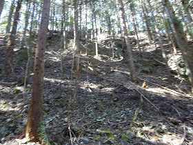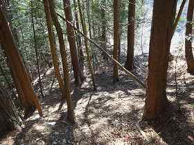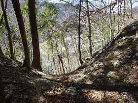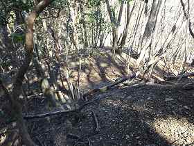 | さらに南側に尾根が長く延びており、そこにも堀切があった。城域はここまでであろう。 | 左の堀切の所まで林道が付いているので、帰りはこの林道を歩いて戻った。途中で1郭方向を見上げると、険しい急斜面となっているのが分かる。 |