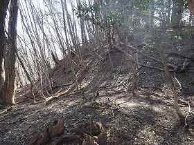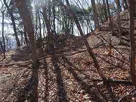 | 尾根の鞍部にある堀切。切通しの山道ともなっていたようだ。 | その上にある傾斜した腰曲輪。ここから北側の帯曲輪に回り込んでいくと、竪堀が掘られているので、そちらが本来の登城ルートであった可能性がある。 |