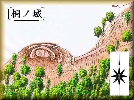 赤い鳥居をくぐっていくと尾根は次第に下降してくる。右の鳥瞰図の右上の部分である。ここから比高50mほど降っていくと鞍部の尾根に出る。この時正面手前に見えているのが桐の城山である。