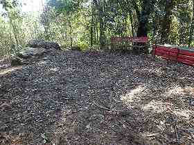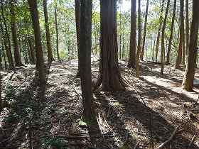 これだけである。林道を少し北側に戻ったところの脇には、わりと広い平場があった。山頂部分だけではあまりにも狭いので、これも郭なのであろうか。また、土の城への衝動を見ると、そのさらに下には段々の地形が見られるというが、こちらは今回は確認していない。