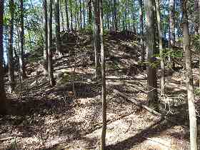 | 西側の堀切。 | この堀切を降りて腰曲輪から1郭城塁を見たところ。 |