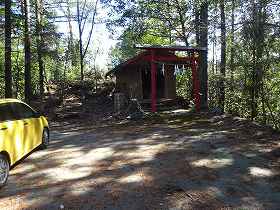 ところがナビの地図にはこの道は記載されていなかった。だから取り付け道路の入口がどこなのか分からない。そこで南側の山麓の集落内部に入り込んでいったら、山の方に進んでいく道がはっきりと見えている。それを目当てに登り口を探して進んでいくと、入口はすぐに分かった。この地点であり、ここに赤い鳥居が建てられている。