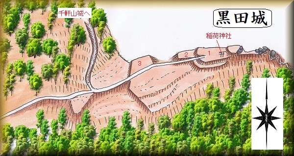 3郭のさらに西側には山稜が迫ってきている。このさらに西側に比高320mほど登ったところには千軒山城がある。こちらへの案内もあり山道もしっかり付けられているのであるが、「所要時間50分」とあるのを見て、時間の関係上、今回は断念することにした。黒田城から比高320mを踏破するためには、探索時間も含めて往復2時間ほどは見なくてはならないと思う。