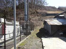 | 鉄塔のメンテナンス道路の入口の手前脇から見た旗ヶ城。この鉄塔を目印にしていけば、城址に到達できる。 | 未舗装の荒れた林道を頑張って走って鉄塔の所まで来た。鉄塔建設でかなり破壊されているが、ここは腰曲輪の跡であるらしい。 |